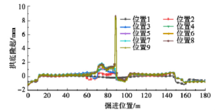 图9 不同掘进位置时隧道拱底隆起曲线