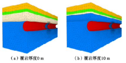 隧道上方的覆岩厚度对保证隧道围岩及开挖面稳定性有积极作用,本小节采用FLAC 3D 有限元软件进行数值模拟,分别建立不同覆岩厚度下隧道对接施工的三维流固耦合模型,对比分析不同覆岩厚度时围岩的稳定性,得出确保施工安全的最小覆岩厚度。