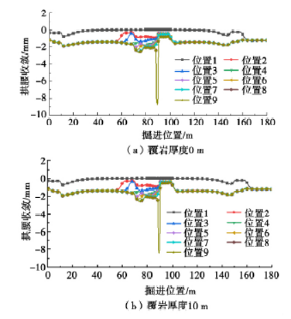 根据覆岩厚度的不同,共建立了10 种覆岩厚度计算模型,分别为0 m、0.5 m、1 m、1.5 m、2 m、3 m、4 m、6 m、8 m、10 m,如图10 所示。通过对覆岩厚度为0.5 m 的对接模型进行流固耦合分析可知,两侧盾壳间围岩变形随施工过程变化较大,而海底地层沉降、土压力变化较小,因此以隧道围岩变形作为围岩稳定性的控制指标进行对比分析,得出覆岩厚度对围岩变形的控制效果。本次模拟中围岩变形包括拱顶沉降、拱腰收敛及拱底隆起。
