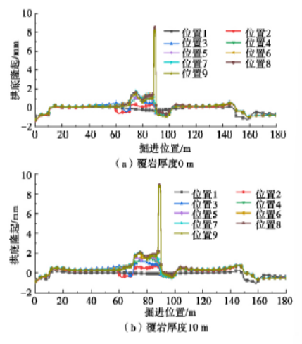 图15、16 给出了拱底隆起随覆岩厚度的变化规律。从图中可以看出,当盾构拆机后,两侧盾壳间围岩拱底隆起突然增大,而其他位置处拱底隆起相对较小。在不进行注浆或冻结加固情况下,随着覆岩厚度的增加,拱底隆起值变化幅度较小,约为0.68mm,说明覆岩厚度变化对拱底隆起影响很小。