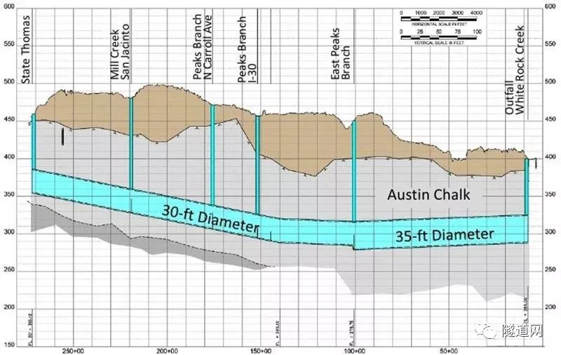 美国德州Mill Creek排水隧道全长8km,上游5.2km段(峰值流速424 m³/s)为圆形断面,而下游2.8km(峰值流速565m³/s)则为马蹄形断面。
