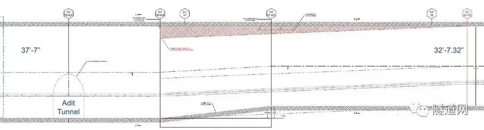 隧道沿线设有五个跌水井与侧向隧道,变径区位于隧道侧向隧道A的位置:这是一条使用挖机建成的直径6m、长90m的马蹄形隧道,与深52m,直径6m的跌水井A相连。