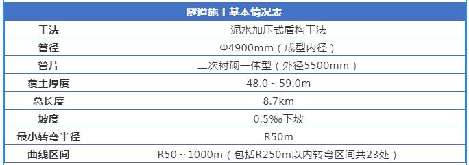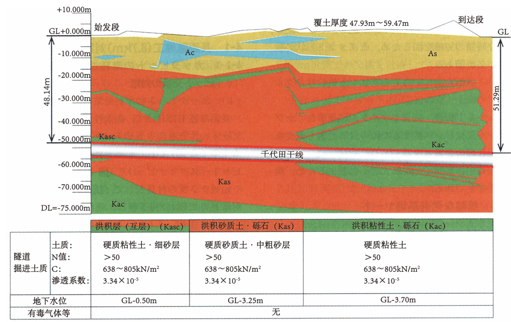 千代田干线隧道内径4.9m、全长8.7km,工程采用了泥水式盾构进行一次性长距离掘进,盾构隧道平均覆土厚度50m、最大覆土厚度58.6m,处于高水压条件下施工。