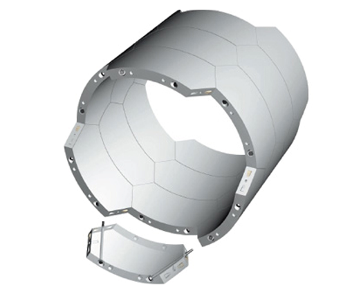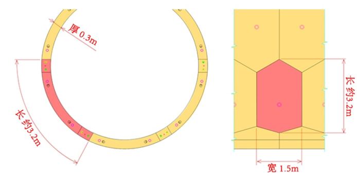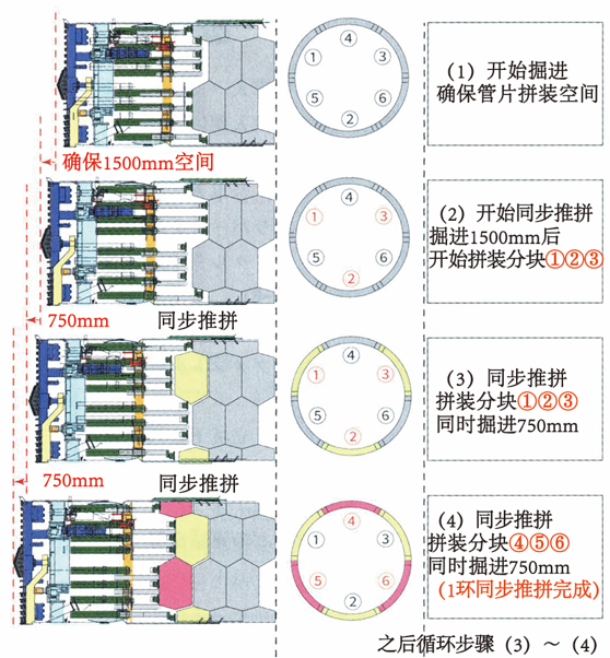 六边形管片所有分块形状统一,拼装位置保持在同一位置。接头螺栓是预置在管片内的贯通螺栓,采用螺栓自动拧紧机紧固,缩短了管片拼装时间。由于六边形管片在拼装过程中会具有凹凸面,凸面可用于油缸顶推掘进,凹面可用于拼装,从而实现同步推拼。
