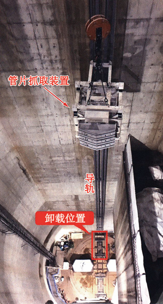采用无需供电的机械式抓取装置抓取管片,随后配备导轨防止管片垂直运输至基坑底部过程中发生摆动,并采用起吊安全警告系统确保物料吊放至竖井时的安全问题。