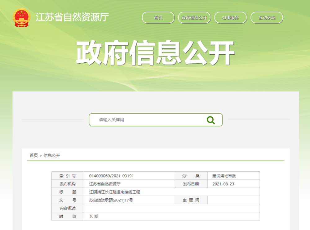 近日,江苏省自然资源厅批复了关于江阴靖江长江隧道南接线工程和北接线工程项目建设用地预审。此次项目建设用地预审获得省自然资源厅批复,为项目工可的核准立项奠定了坚实基础。