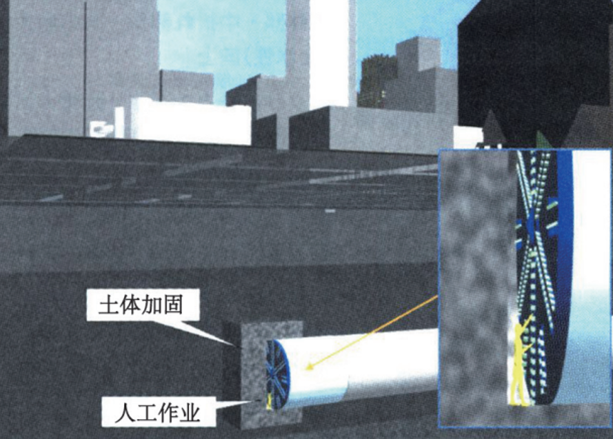传统换刀即利用人工直接换刀,通常是先修建中间井,盾构机到达中间井后进行换刀。城区内因建构筑物密集,无法构筑中间井,故采用高压喷射搅拌法或冻结法进行土体加固方式确保开挖面周围土体自立性,然后作业人员从开挖面前方换刀。