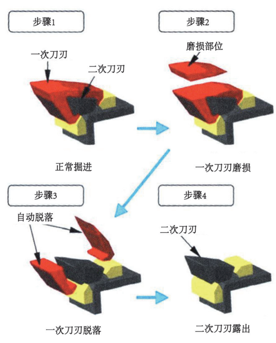 日本开发了多种长寿命刀具技术,比如:刀具的刀刃使用硬度仅次于金刚石的钨和钴混合加工形成的超硬合金;开发嵌入多道超硬刀刃的强化型先行刀;在长距离施工中,不同先行刀采用梯次布置;研发内外双层刀刃叠合的结构,外侧的一次刀刃磨损脱落后,内侧的二次刀刃露出。