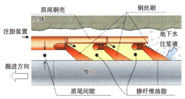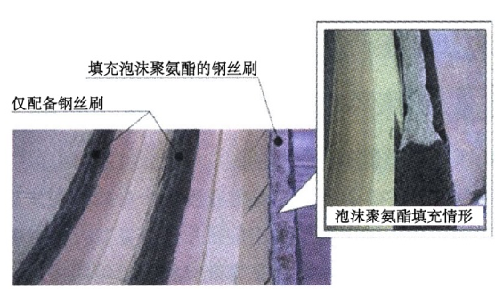 在长距离施工中,盾尾密封需要具有耐磨损性。在上世纪70年代前期敞开式盾构为主流的年代,主要采用橡胶制盾尾密封;随着70年代中期密闭式盾构问世,相应设计了由细钢丝组成的钢丝刷式盾尾密封,逐步应用在绝大多数的盾构机中;在90年代后期,为了进一步提高盾尾密封的止水性能和柔软性能,在以往的钢丝刷基础上填充泡沫聚氨酯,使其具有更好的长期耐久性。