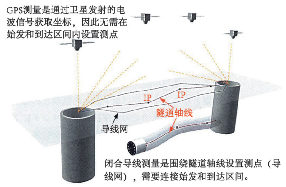 地面上的基线测量传统技术大多采用闭合导线测量,即采用闭合导线测量方法设置连接始发井和到达井的测点。由于包围隧道轴线的多边形测点闭合,因此精度较高。但距离增长后测点相应增多,精度会随之下降。1990年左右,日本研发GPS(GNSS)测量技术并投入应用,利用GPS测量卫星发送的电波测量位置,因此无需测点间目视,长距离情况下也能保证精度。