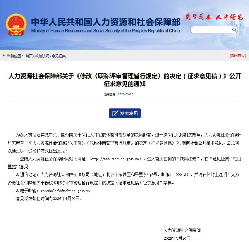 近日,人力资源和社会保障部研究起草了《人力资源社会保障部关于修改〈职称评审管理暂行规定〉的决定(征求意见稿)》(以下简称《征求意见稿》),正在向社会公开征求意见,意见反馈截止时间为2026年4月20日。