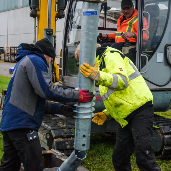 最终方案下,集装箱两侧各七个螺旋地钉,以45°角拧入并通过钢架连接到框架上。为了达到所需的负载能力,地钉可以打入地下5米深度。