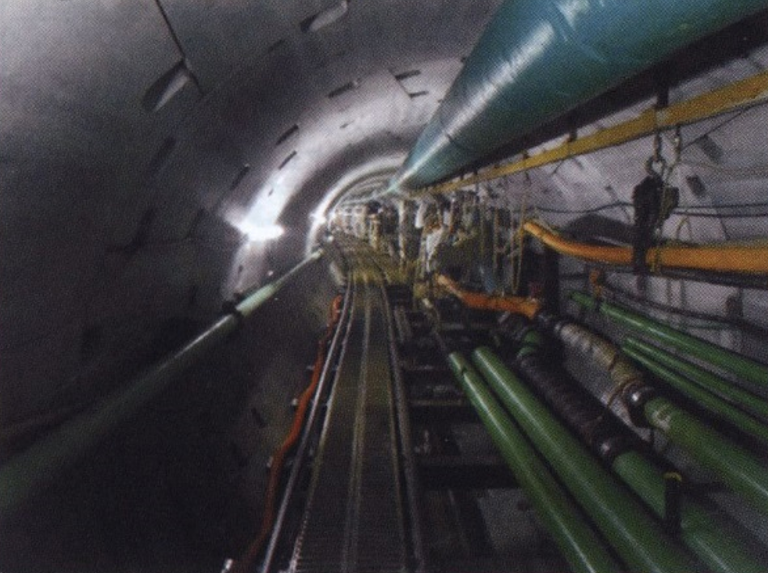 该排水隧道一次掘进长度8.7km,达到日本最长的单次掘进长度。沿线设置的6个中间井都是在一次衬砌完工后施工,因此无法通过中间井进行盾构机检修或移动地面设备。针对长距离施工采取洞内物料运输的高效化、有计划地实施部件和配管更换等措施确保施工进度。