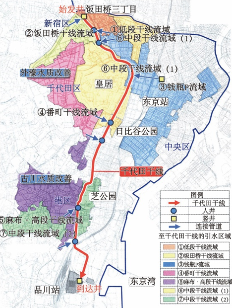 东京下水道千代田干线工程是采用泥水平衡盾构法施工1条长约8.7km、内径4900mm的长距离隧道,平均覆土厚度达到50m。盾构机需穿越铁路隧道、地铁车站、综合管廊等多个风险点。作为大深度盾构隧道,包括始发和接收在内整体施工都处于高水压条件下。