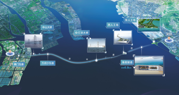 深中通道是国家高速公路网G2518跨珠江口的重要组成部分,北距虎门大桥约30公里,南距港珠澳大桥31公里,起于深圳机场互通,与广深沿江高速二期相接,向西跨越珠江口,在中山马鞍岛登陆,与在建中开高速对接,并通过连接线实现在深圳、中山及广州两岸三地登陆。项目集“桥、岛、隧、水下互通”于一体,全长约24km,是当前世界上综合建设难度最高的跨海集群工程。