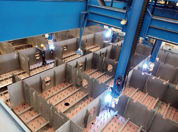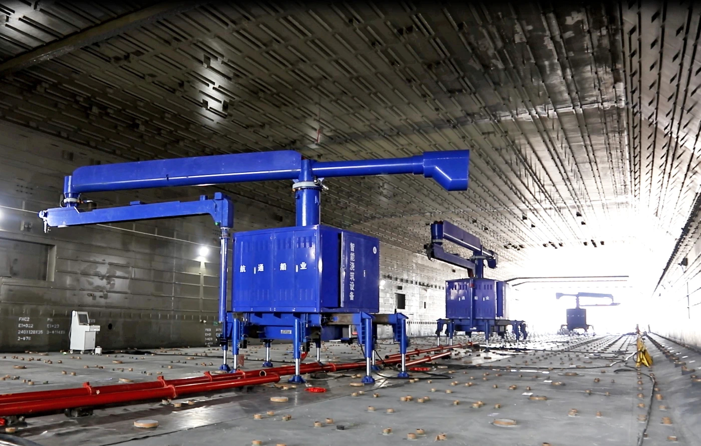 深中通道海底隧道长约6.8km,其中钢壳混凝土沉管隧道标准管节长165m、宽46m、高10.6m,重量近80000t。按照施工计划,必须要达到每月出厂一节钢壳的速度,才能满足项目建设需要。为此,深中通道打造了国内首条大型钢结构“智能制造四线一系统”,并分别在广船国际和黄埔文冲船厂进行应用,在国内首次实现了大型钢结构块体智能焊接及智能喷涂,极大提高了焊接的质量和速度。